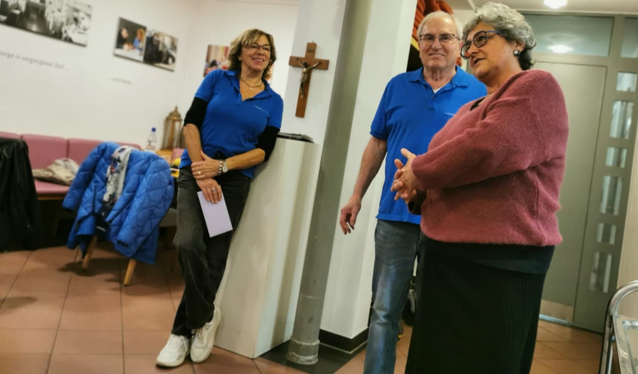 Sergio Rota, Geschäftsführer des Cafés, und Eva Mihm, Vorsitzende des Vereins, begrüßten die 40 Gäste beim ersten Herzenscafé nach der Sommerpause. Das Wiedersehen begann mit einer Gedenkminute, in